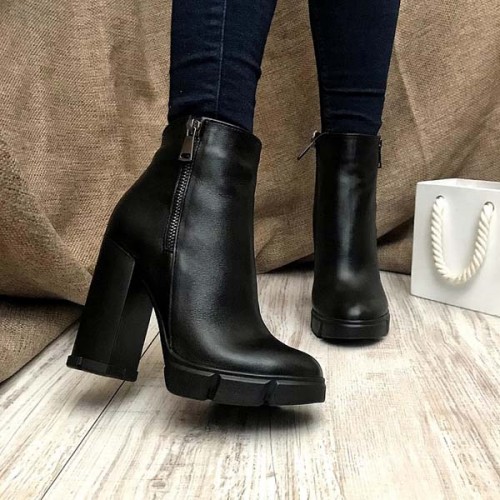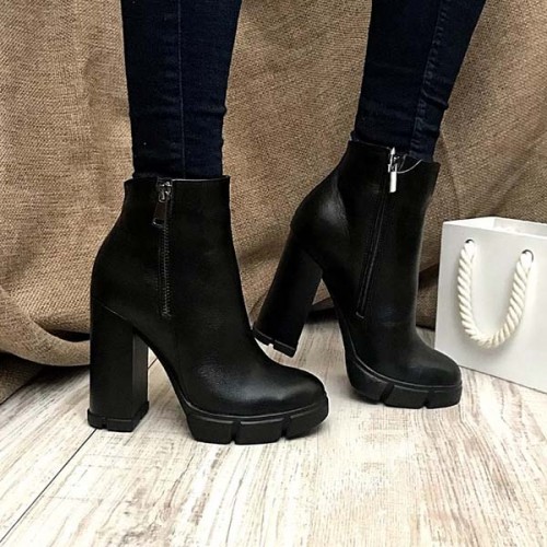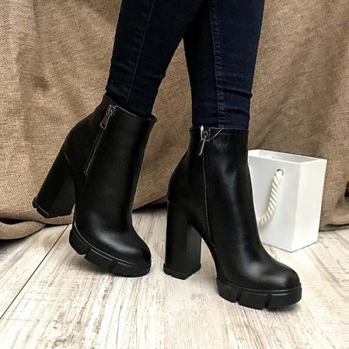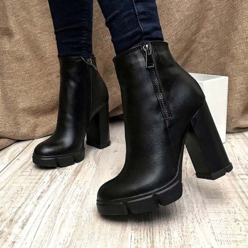 Купить качественные недорогие женские высокие ботинки на каблуке осенние кожаные, внутри флис, цвет: черный в Харькове магазин фламода. Доставка по всей Украине. Интернет магазин flamoda.com.ua