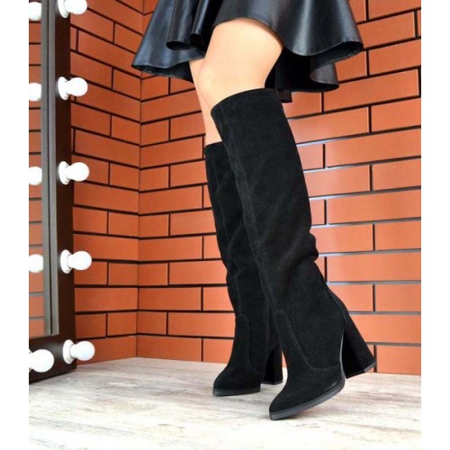 Купить качественные недорогие женские сапоги демисезонные замша кожа, внутри флис, отличное качество, высота 42-45 см, обхват голени 35-39 см, каблук 9,5 см, в Харькове магазин фламода. Доставка по всей Украине. Интернет магазин flamoda.com.ua