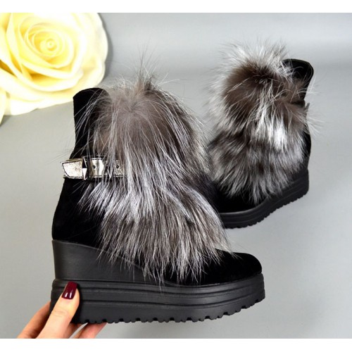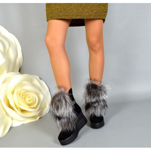 Купить качественные недорогие замшевые ботинки женские зимние на танкетке, внутри натуральный мех (набивная шерсть) опушка - натур.мех чернобурки, высота 19 см, подошва 8/3см черные в Харькове магазин фламода. Доставка по всей Украине. Интернет магазин flamoda.com.ua